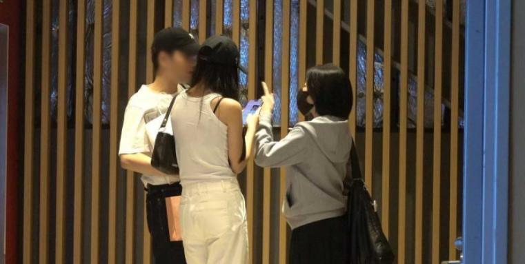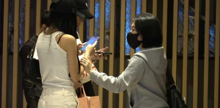 对方也平静地回应小S,表现自然,从互动上看并不算陌生。说了几句话,小S拨弄自己的头发,接着又握着正使用通讯软件中的Lily的手。此外,观察3人的穿着,男子与Lily都戴着黑色帽子,脚踩黑色皮鞋,两人身高相近,打扮也颇搭配,外型看来十分登对,男子的身份,没意外的话应该就是Lily的男友。随后,3人搭乘电梯下楼离开影城。